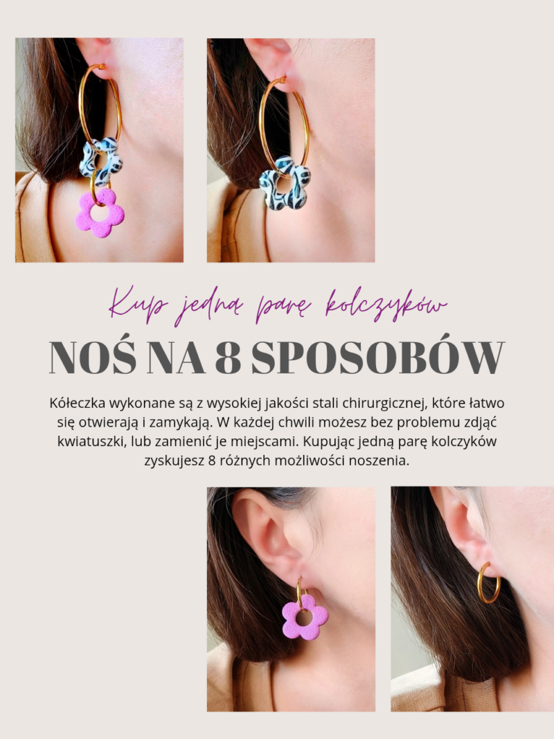 125,00 złKolczyki z kwiatuszkami na złotych kółkach to biżuteria, która daje wyjątkowo dużo swobody. Zawieszki można zdejmować i zakładać w dowolnym momencie, dzięki czemu jeden model pozwala stworzyć aż 8 różnych wariantów noszenia – od prostych, minimalistycznych kółek po romantyczne kwiatowe kompozycje.