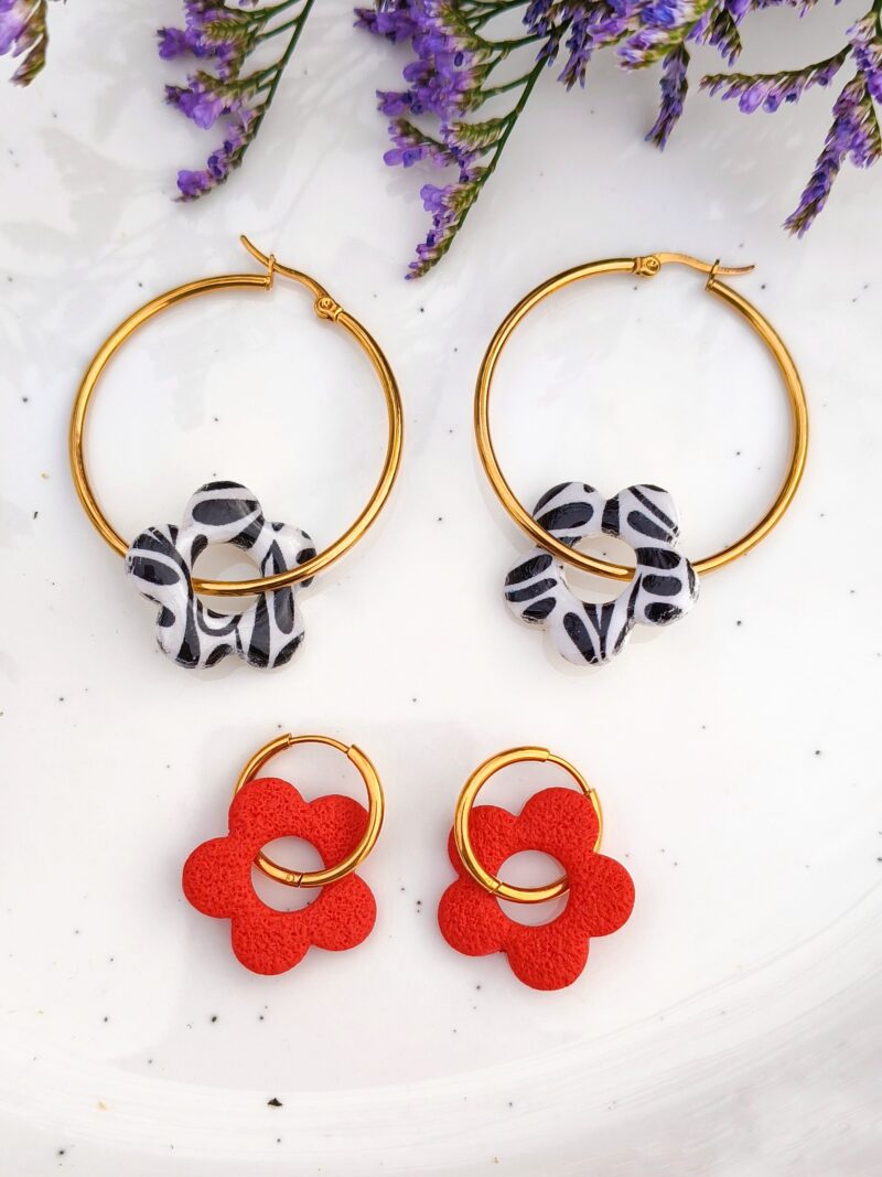 Kolczyki stworzone są z leciutkiej gliny polimerowej. Metalowe elementy są wykonane ze stali chirurgicznej, dostępnej w dwóch kolorach (złotym i srebrnym). Stal chirurgiczna jest tworzywem, które mogą nosić również alergicy.