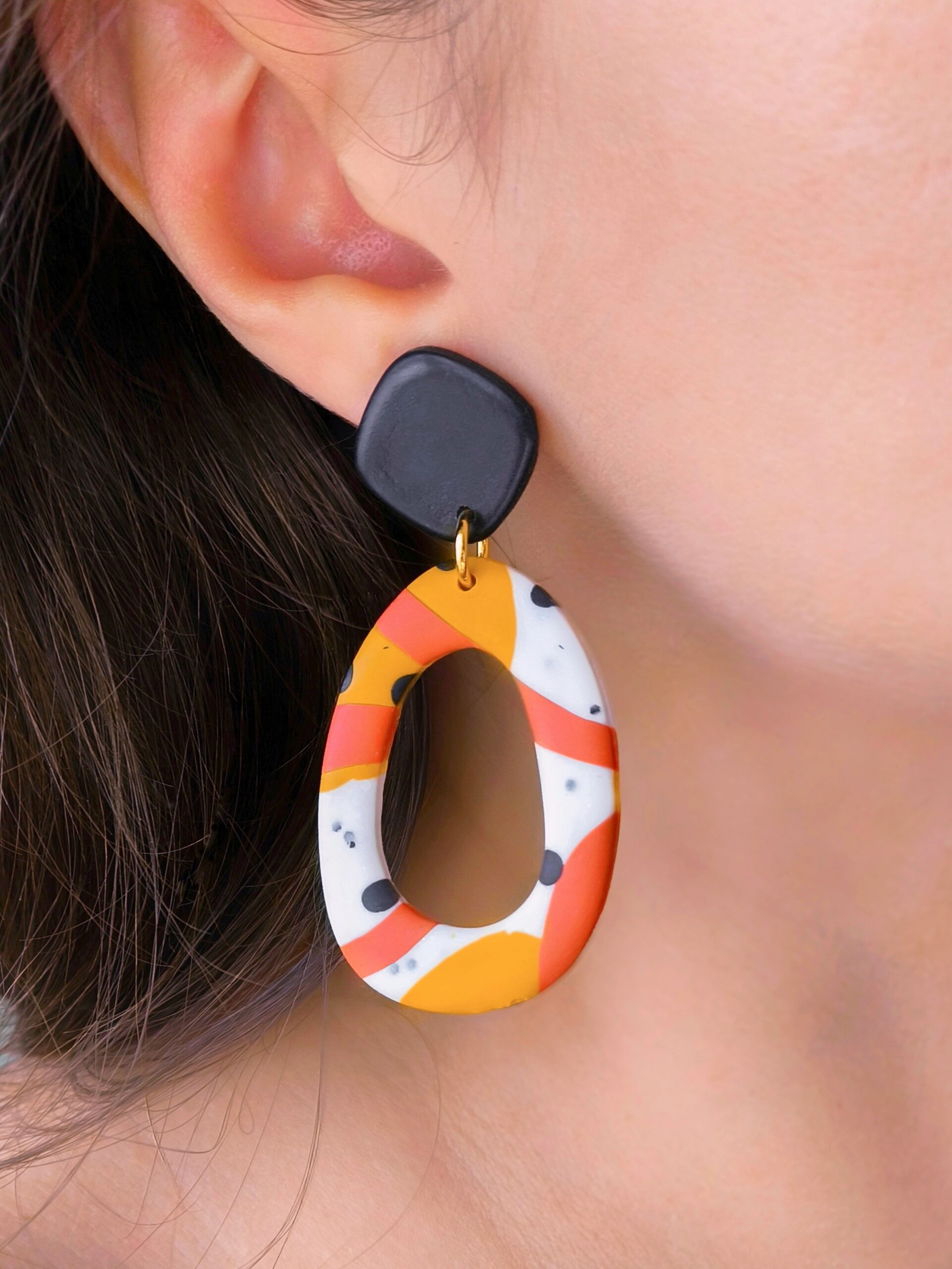 Artystyczne kolczyki z abstrakcyjnym wzorem to biżuteria inspirowana malarstwem i nowoczesnym designem. Ciepła paleta rudości i musztardy przełamana bielą oraz czernią nadaje im wyrazisty, a jednocześnie elegancki charakter. To wyjątkowy dodatek dla osób, które lubią kolorową biżuterię z artystycznym akcentem i wyraźną formą.