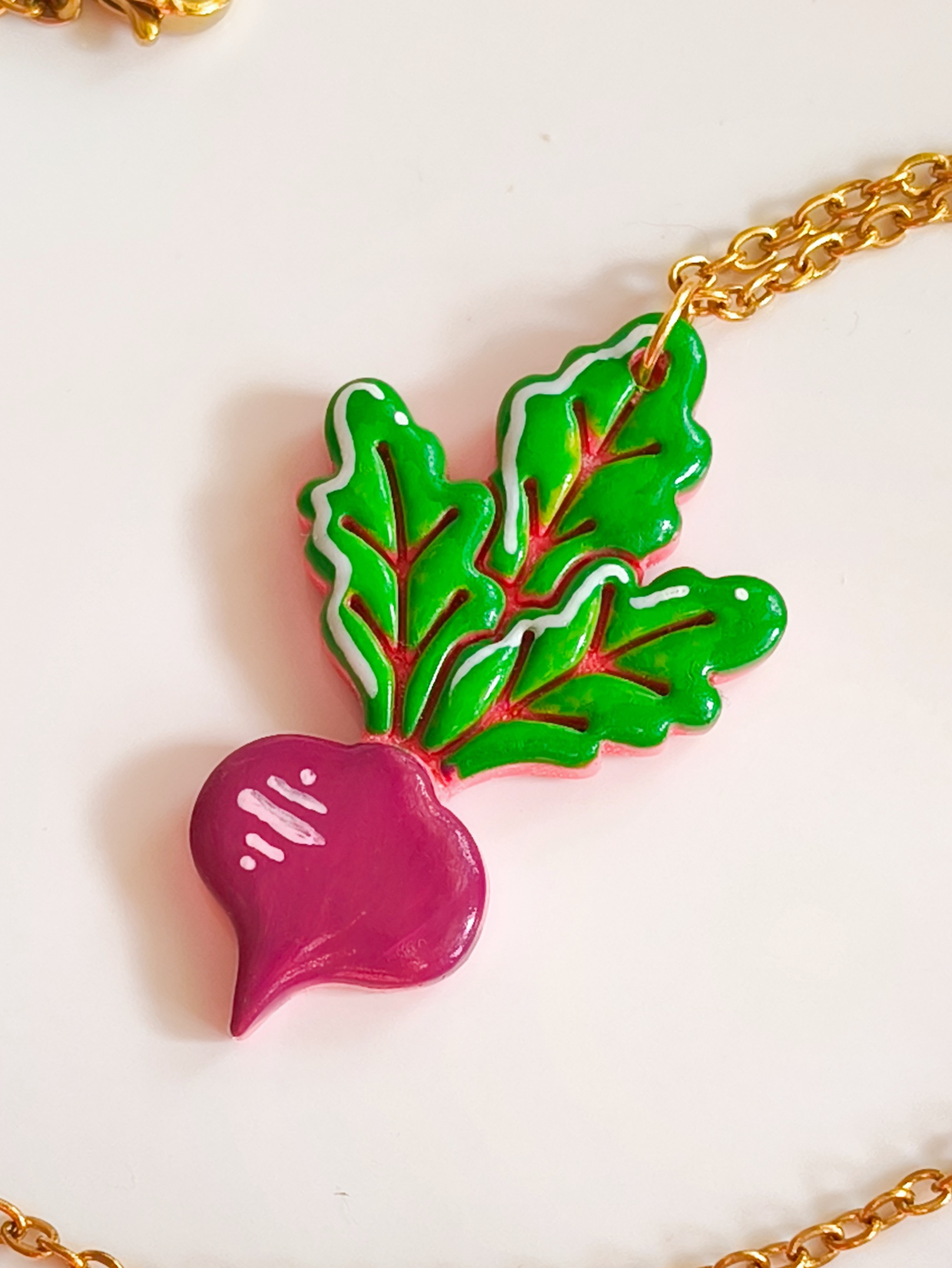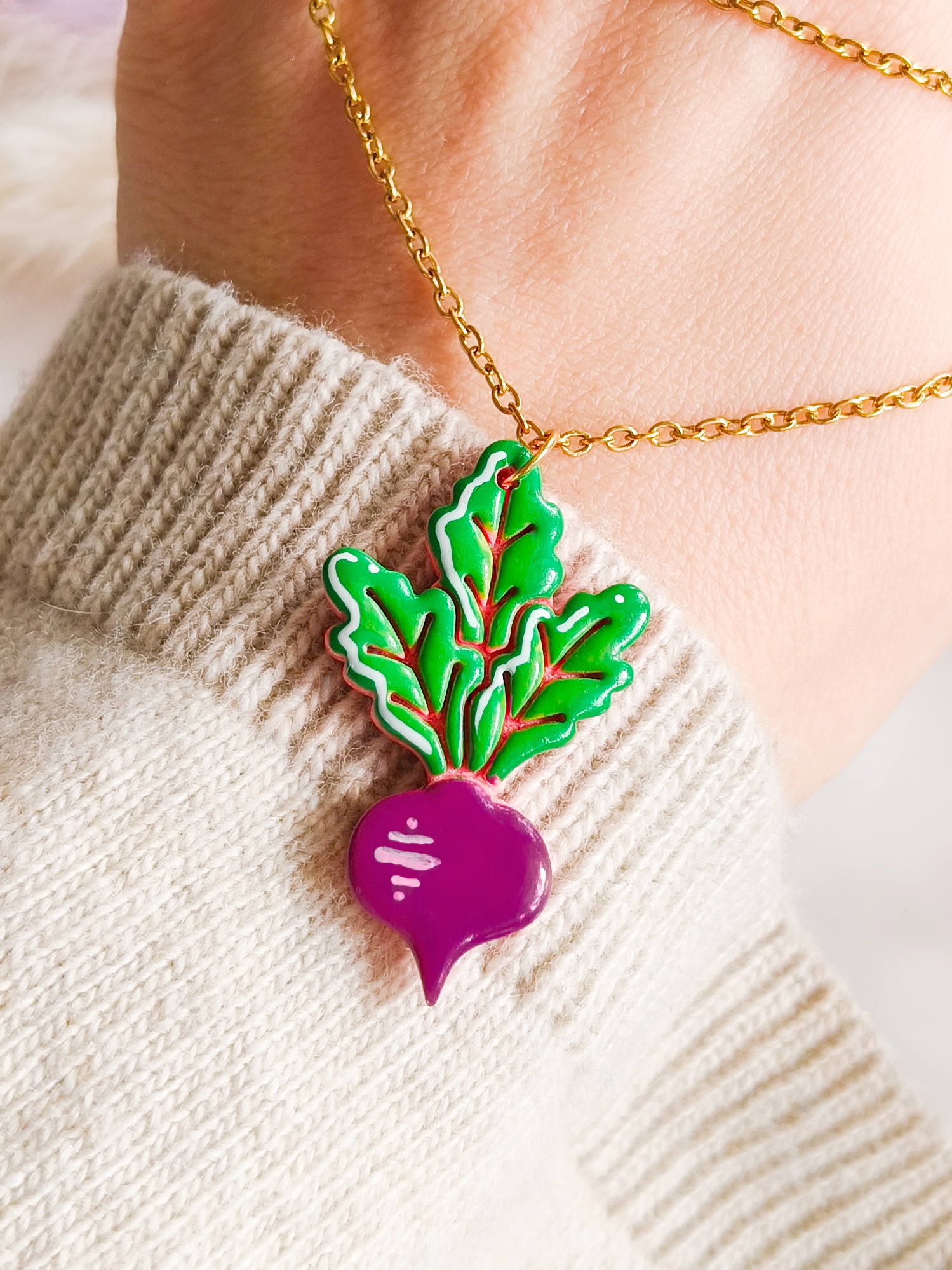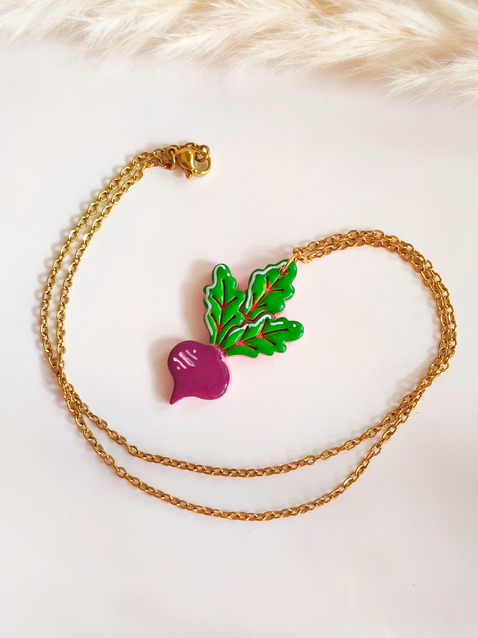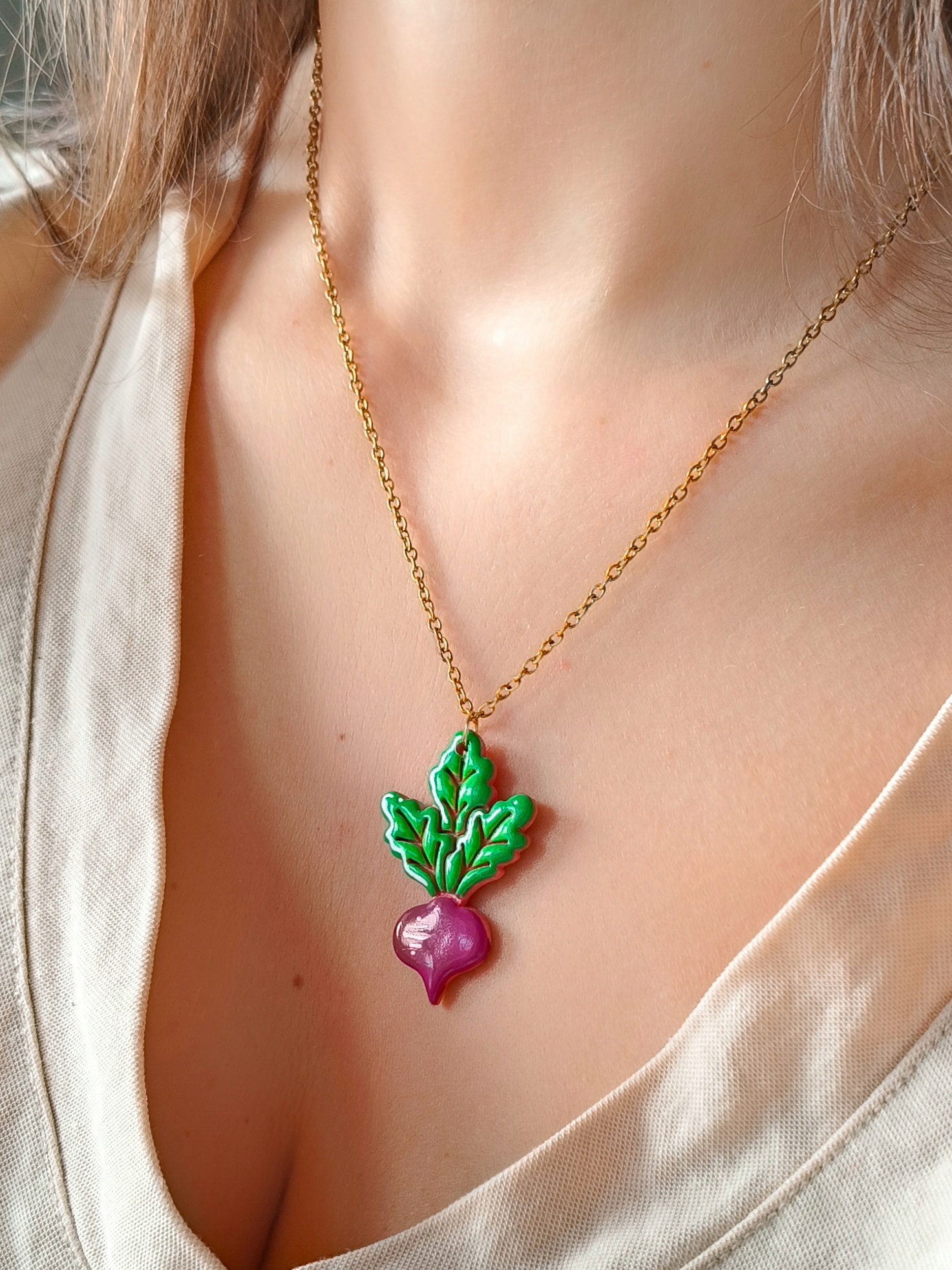 Wisiorek stworzony jest z leciutkiej gliny polimerowej, a metalowe elementy są wykonane ze stali chirurgicznej, dostępnej w dwóch kolorach (złotym i srebrnym – w przypadku wyboru wersji srebrnej proszę o adnotację w wiadomości do zakupu). Stal chirurgiczna jest tworzywem, które mogą nosić nawet alergicy. W przypadku chęci zmiany koloru metalowych elementów na kolor srebrny – proszę informację w wiadomości do zakupu.